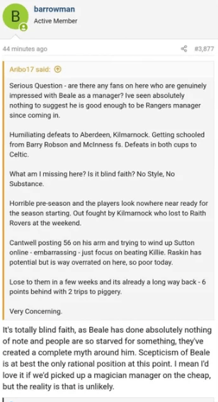 Fore reassurance the Gullible & Deluded were reminded that Todd Cantwell and Nico Raskin had dominated Scottish football in the second half of last season while Beale had stared into the eyes of his new recruits to ensure that they were made of the right character, worthy team-mates of James Tavernier and Borna Barisic.