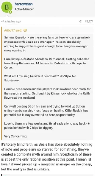Fore reassurance the Gullible & Deluded were reminded that Todd Cantwell and Nico Raskin had dominated Scottish football in the second half of last season while Beale had stared into the eyes of his new recruits to ensure that they were made of the right character, worthy team-mates of James Tavernier and Borna Barisic.
